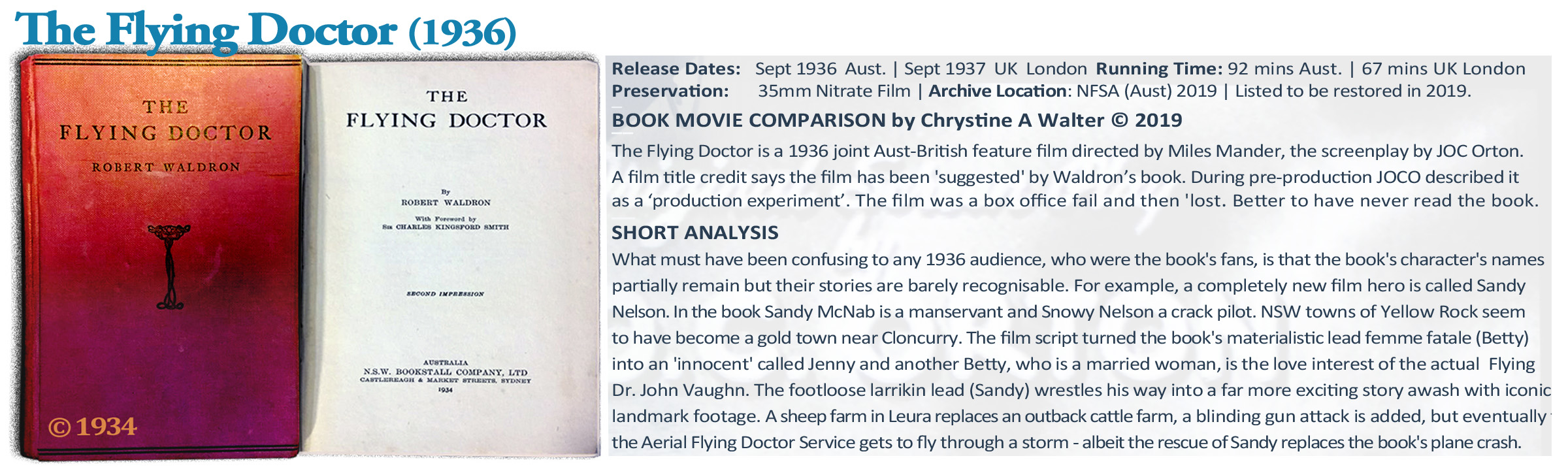 The original book, written by Robert Waldron - Foreward by Sir Charles Kingsford Smith - was the inspiration for the story and script but filmically became barely recognisable as far as the characters and romance action, which were redrawn into a more mysterious and satirical tale. Possibly one of the reasons for its box office disappearance at the time, along with negative press about the 'tourist footage'. Standard visual 'statements of place' nowadays. This issue is dicussed in Interview 1 (below) and credit has to be given to JOC Orton (a keen cricketer) for making the scenario choices, which in 2019, seem to have redeemed the film. Source: The West Australian, 4 Nov 1935. On the upside, 1936 press clippings stated that donations to the actual Aerial Medical Service surged after the film's release!